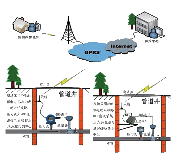 一、系統(tǒng)簡介 為保證供水工作的科學(xué)性,依靠現(xiàn)代計算機通信技術(shù)和傳感技術(shù),實施對供水管道的無人化遠程實時監(jiān)測,并且能夠自動傳輸?shù)缴厦娓骷壷鞴懿块T,監(jiān)測輸水管道、城市供水管道的壓力、流量信息;及時發(fā)現(xiàn)管網(wǎng)故障,提高維護效率、降低損失,保障輸水、供水質(zhì)量,達到科學(xué)預(yù)警,減少成本,提高效率的目的。 二、系統(tǒng)組成 v 監(jiān)控中心:中心服務(wù)器、外網(wǎng)固定IP、管網(wǎng)系統(tǒng)軟件; v 通信網(wǎng)絡(luò):基于移動GPRS或者電信CDMA的通信網(wǎng)絡(luò)平臺; v 采集終端:無線壓力表/低功耗遙測終端BTU; v 測量儀表:流量計/脈沖水表、壓力變送器、報警設(shè)備等; v 供電方式:電池供電、太陽能供電、市電。